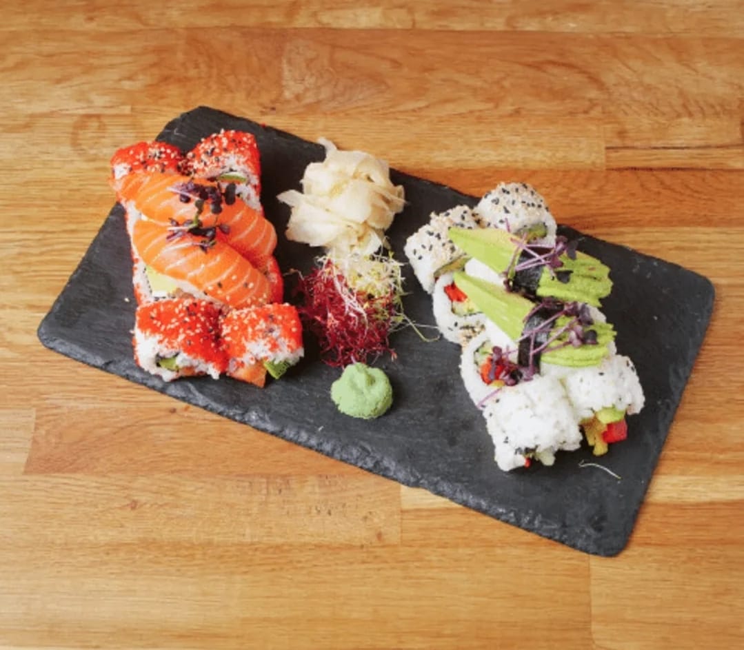 2 Stk. Sake Nigiri, 2 Stk. Avo Nigiri 8 Stk. Veggi I.O, 8 Stk. Sake I.O