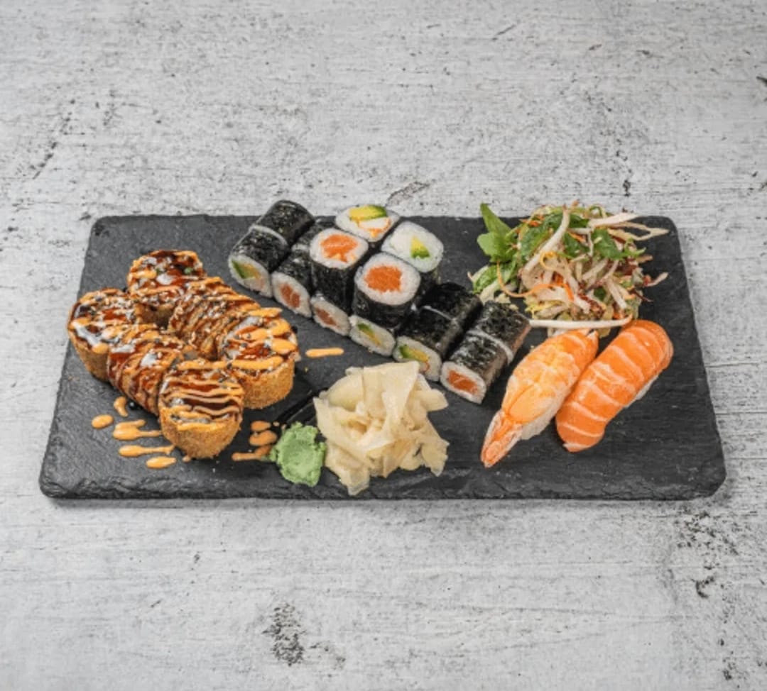 1x Sake Nigiri, 1x Ebi Nigiri, 6x Sake Spicy Crispy, 8x Sake Maki, 8x California Maki